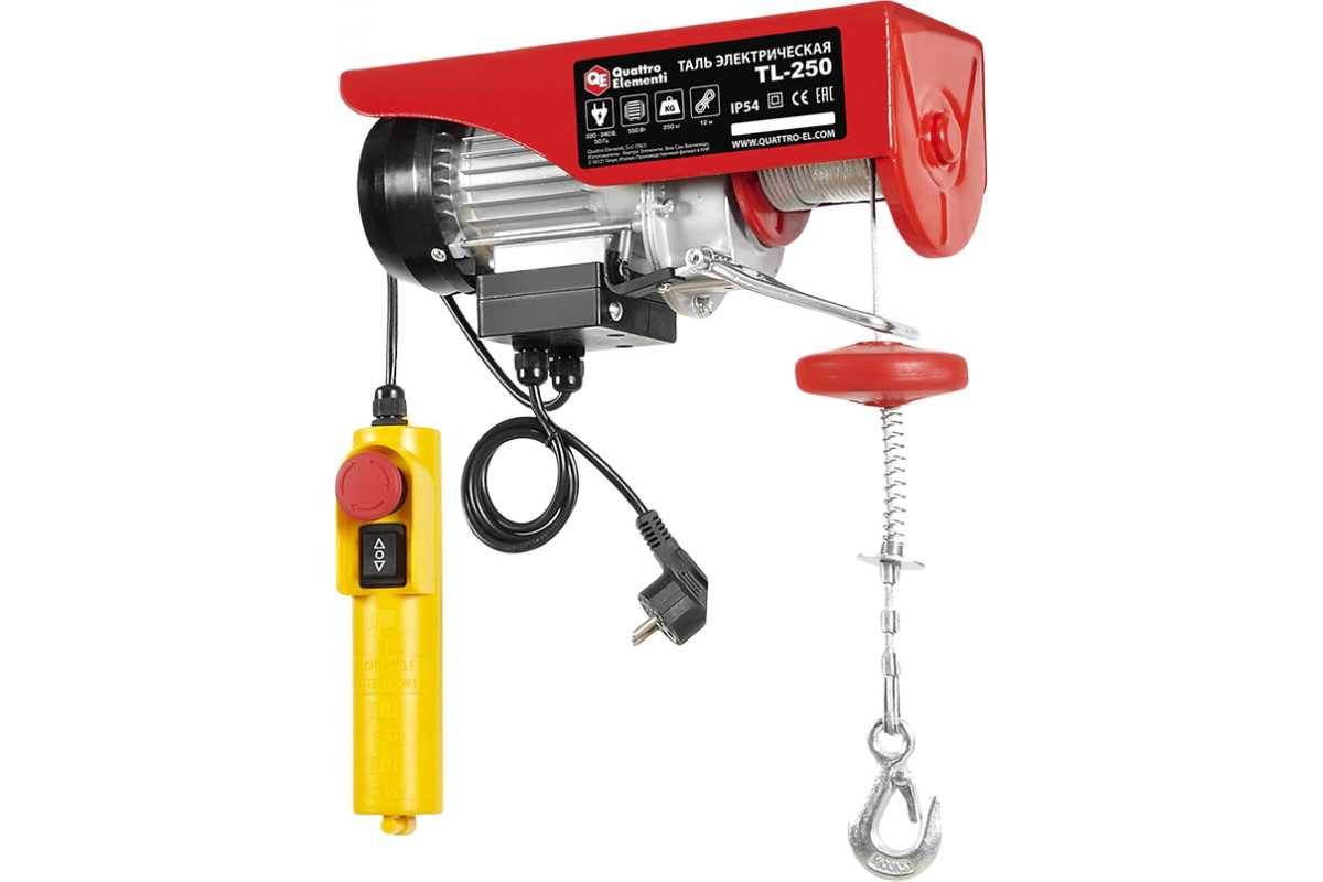 Электрическая таль QUATTRO ELEMENTI TL-250 550 Вт, 125/250 кг, трос 12 м, блок полиспаст в компл. 793-688 предназначена для подъема и опускания грузов весом до 250 кг на высоту до 6 м (125 кг - до 12 м). Данная модель может использоваться в рабочих зонах, гаражах, подсобных и производственных помещениях, на строительных и ремонтных площадках, складах, сервисных станциях. В комплект поставки входят специальные крепления для фиксации тали на балке и блок полиспаст.
