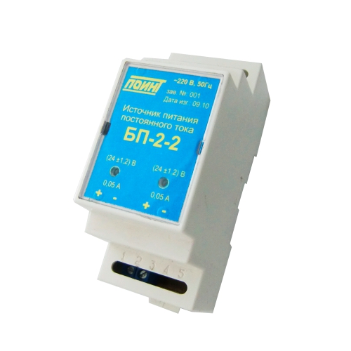 БП-2 предназначен для питания источников максимальной мощностью до 2,4 Вт. Изготавливается одно- и двухканальный. Крепление на Din-рейку. Характеристики БП Выходное напряжение, В: 9, 12, 24 В. Количество гальванически развязанных каналов:для БП-2 – 1, 2; Максимальная мощность источника питания, Вт:для БП-2 – 2,4; Масса не более, кг:для БП-2 – 0,2; Средняя наработка на отказ 65000 ч. Средний срок эксплуатации не менее 10 лет. Гарантийный срок эксплуатации18 мес. со дня ввода в действие. Электрические параметры Питание ИП от сети переменного тока частотой (50±1) Гц и напряжением 230 (+23  -35)В. Амплитуда пульсации выходных напряжений не более 1 %. Изменение выходного напряжения при изменении: напряжения сети на ±10% - не более 1%; тока нагрузки от 0 до max – не более 1%; температуры на 1– ºС           не более 0,5%.