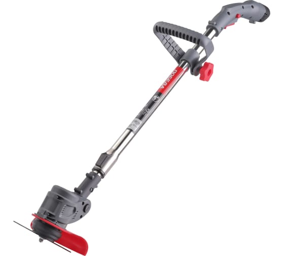 Лёгкий бытовой аккумуляторный триммер с регулируемой D-образной передней рукояткой, телескопической штангой, изменяемым углом наклона головки.